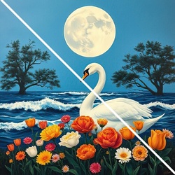 Emotional Impact: Natural imagery often triggers positive emotions, such as tranquility, joy, or nostalgia. The graceful swan, vibrant flowers, and serene lake can serve as a reminder of purity, elegance, and the simplicity of nature, offering an emotional escape from daily stress.